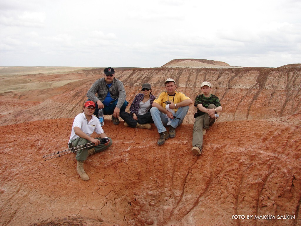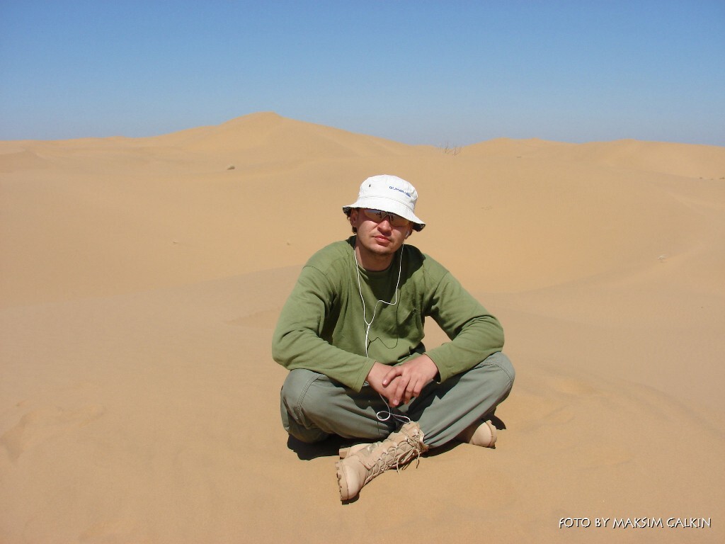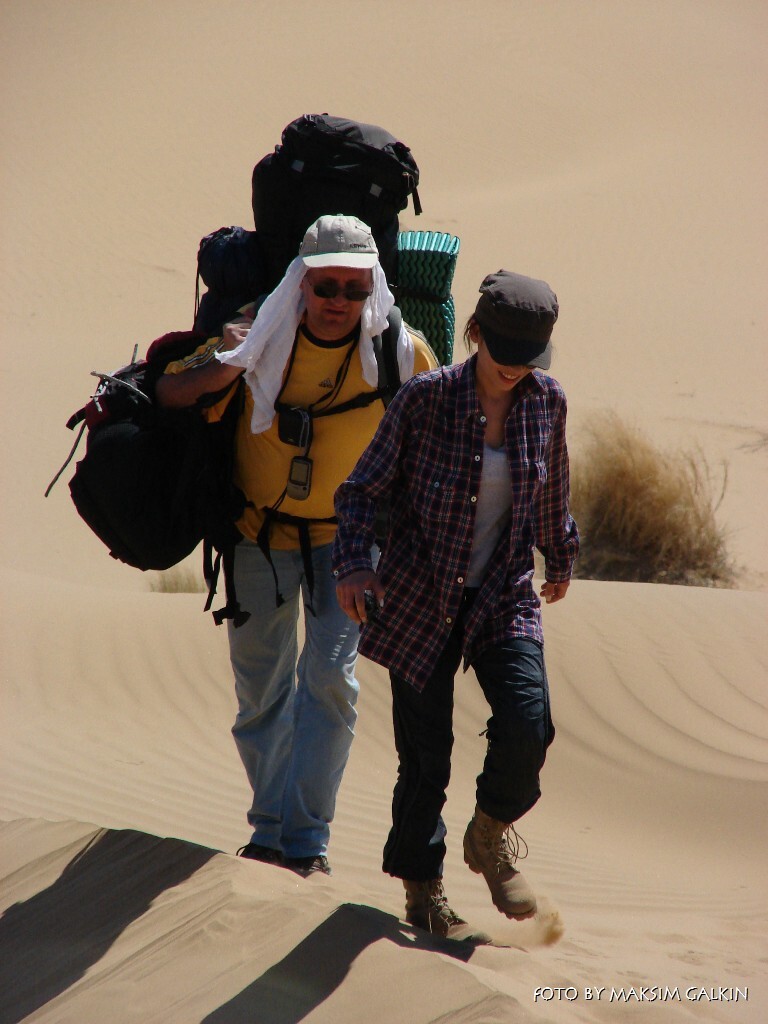 Утро встретило мелким и прохладным дождичком, который был очень кстати, головная боль не так болезненно проходила да и спас рассол, так беззаботно оставленный коллегами на улице, после нашего ужина. Это был самый вкусный и холодный рассол, можно сказать глоточек жизни. Все медленно и не торопясь начали просыпаться. Позавтракав, решили более детально изучить поселок, который соседствовал с нами рядом. Зрелище, честно говоря, завораживающее, ведь когда то здесь была жизнь, не сказать что кипела, просто была. Люди занимались разведением верблюдов. Сейчас здесь только остатки от стен их домов, брошенные тандыры, и останки техники. Сейчас здесь господствуют черепашки и другая ползучая живность. Идеей экспедиции было изучение этой местности, и я вот хожу по этому месту и думаю, а найдутся ли люди, которые так же захотят потратить свои деньги на такое путешествие. Хотя с другой стороны мы же приехали, и получаем удовольствие от этого заброшенного мира, где нет ни капли цивилизации, только песок и причудливая природа со своеобразной, какой-то космической, жизнью.Но все самое интересное было еще впереди. Начались сборы нашего провианта и лагеря, и так как мы шли по пустыне, воды у нас по дороге нигде не встречалось. Всю воду мы несли с собой, а это без малого по 15 литров на человека, можно конечно было обойтись и более малыми жертвами, но это была наша пробная экспедиция, и мы не моли себе позволить умереть от "Жажды". И вот мы с этими огромным рюкзаками отправились в путь, после пары шагов стало понятно, что идти будет не легко, но опять же это были только цветочки, так как мы еще не вошли в пески, пока мы шли еще по такыру, а там довольно твердый грунт. Просматривая со спутника весь наш маршрут, Гена с Сергеем делали отметки мест, которые хорошо было бы посмотреть, так вот одно из таких мест лежало на нашем пути. Мы его окрестили "марсом", из-за специфического окраса грунта, тут присутствовали практически все цвета радуги. Но основным оставался красноватый оттенок, что создавало ощущения присутствия себя на другой планете. Единогласно было решено назвать эти холмы -"марс". Как раз с этих холмов хорошо просматривался наш маршрут, и вдали виднелся ярко желтый горизонт, состоявший из тех самых дюн. Послонявшись еще не много на красно-зеленых холмах, мы отправились к заветной цели. Скажу вам честно, идти было сложно, шли по барханампокрытыми растительностью. Когда-то в советское время была программа по остановке движения песков Кызыл кумов, и над пустыней с самолетов сеяли семена растений и многие прижились, пустынные деревья теперь сдерживают движение песков. Вот нам пришлось идти среди всей это растительности. Пейзаж трудно описать, да и у меня наверно не хватит моих литературных способностей. Могу только сказать, что на это стоит посмотреть. Настоящая дикая природа! Двигаясь мелкими переходами, постоянными подъемами и спусками по небольшим барханам, мы уже уставшие добрались до долгожданных дюн.