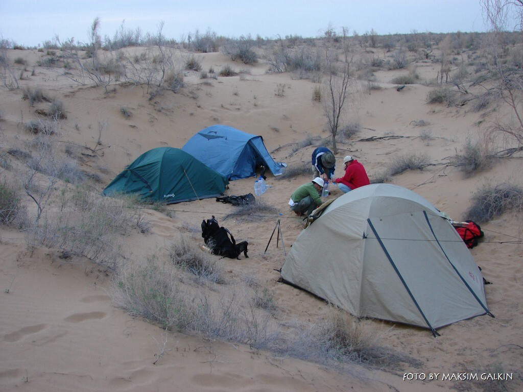 Завтрак, уборка территории, закапывание мусора. Сегодня уже легче, ведь часть воды потрачена. Мы даже попевали такую песенку, что завтра будет легче, чем вчера. Утром после завтрака решили немного прогуляться по дюнам без рюкзаков, так как с ними идти по голому песку ну очень тяжело. Поэтому мы, не опасаясь за свои вещи, отправились исследовать окружающие нас пески. После небольшого ланча на песке и с песком, нас ждал переход от дюн к меступаломничества местных жителей, к "Канарбай ота". Но естественно за день туда не дойти, поэтому нас ждала еще одна ночевка. Сначала было решено, как можно больше пройти все-таки по дюнам, но поняв, что это очень сложно, решили сместить свой маршрут и пошли опять по заросшим барханам, где нас уже заждались местные клещи. Кстати их там было очень много, нападают стаями, только, решишь остановиться. Поэтому совет, при планировании путешествия в пустыню продумать,одежду и средства зашиты от насекомых.И постоянно быть внимательным,у нас обошлось без пришествий. Сегодняшний день, был не менее интересным, так как рельеф постоянно меняется и не перестает удивлять своими красотами. Так, например впадины от небольших озер, предположительно живущих не большой и не продолжительной жизнью, а возможно даже уже давно не живущих. Вечер прошел как обычно, единственное, что его отличало это то, что мы натаскали кучу сухих маленьких деревьев и устроили большой костер, пытались поймать радио на приемнике. Это был первый контакт с цивилизацией за эти два дня.