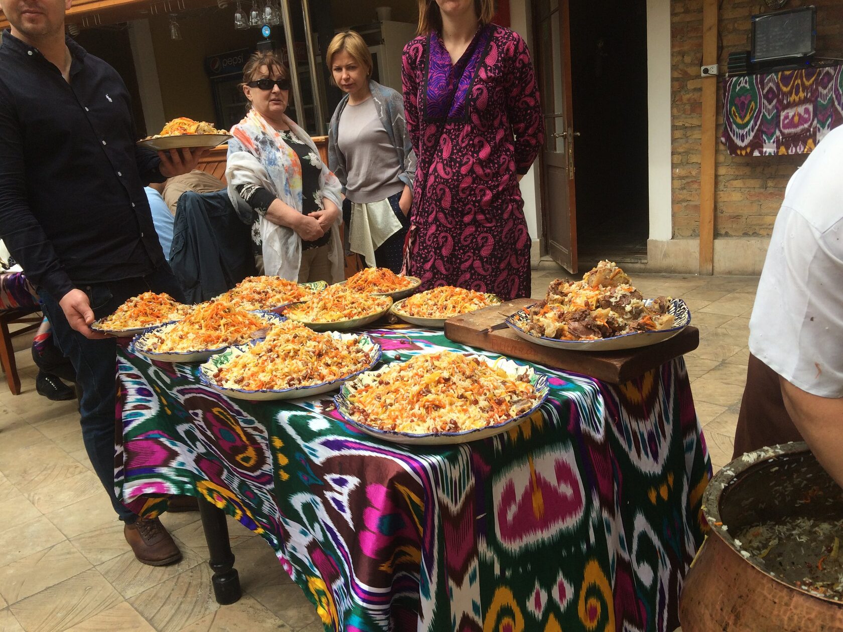 Повторюсь еще раз про еду. Ташкент, конечно же, порадовал меня всякими "вкусняшками" типа шашлыка, плова и лагмана. В Бухаре я предложил сделать ужин в средневековом медресе "Гаукушен". Нам приготовили отличный "Казан-кабоб". Я так понял, некоторых не устроила цена за ужин. Просто, на мой взгляд, если учитывать, что цены сейчас практически везде одинаковые на продукты питания, то 10 долларов за ужин в таком месте, это довольно приемлемая цена. Где-нибудь в Европе это стоило бы раза в два больше, а может и в три. Самарканд нас встретил своим знаменитым пловом в Иранском квартале. Я не помню такого дня, чтобы, побывав в Самарканде, я не посетил бы это заведение, Анвар( хозяин заведения) как всегда удивляет своих клиентов красочной подачей плова, блюда украшает фаршированными перепелками и перепелиными яйцами, зеленью, Казы (колбаса из конины). А вечером мы всей своей огромной компанией приехали в "Каримбек" неплохой ресторан с танцами и огромным выбором меню.